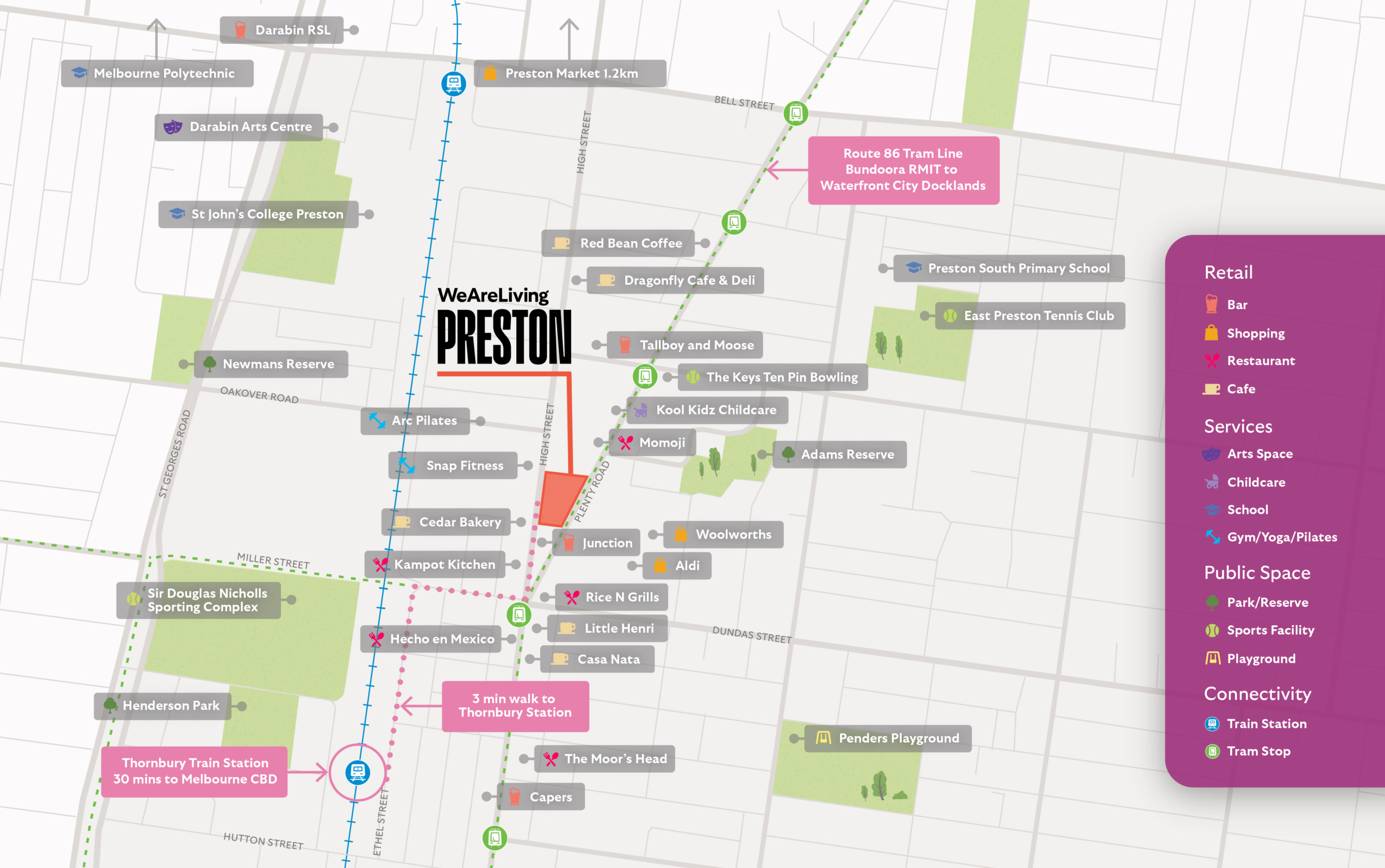 Anchored by the iconic Preston Market, this vibrant suburb is bursting with fresh produce, street food, cafés, bars, and indie shops.With a lively community spirit, quick tram, bus, train and bike links to the CBD, plus High Street dining, live music venues, and nearby green spaces like Adams Reserve, Preston has everything you need – all wrapped in unmistakable local charm.